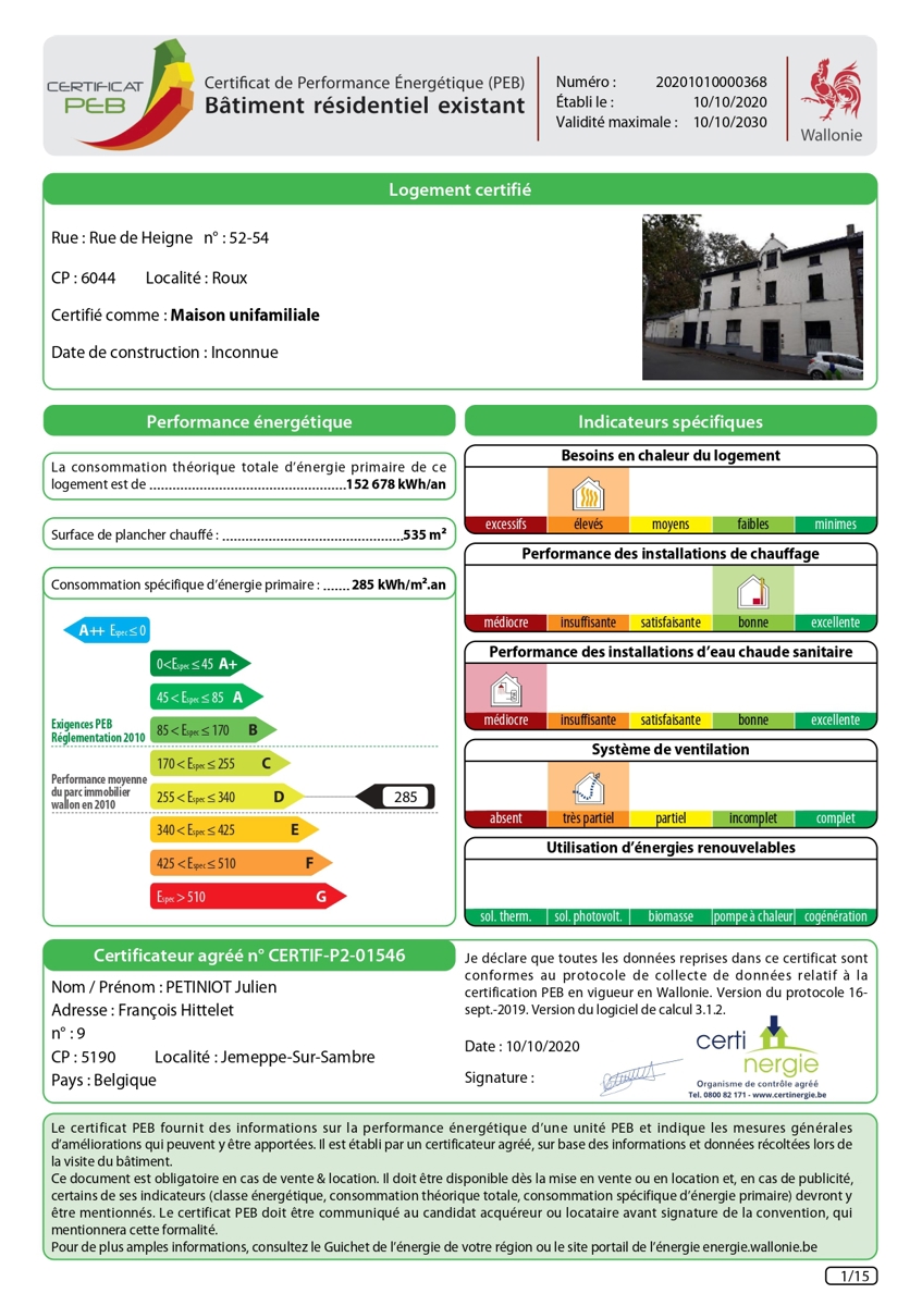 PEB D – n°20201010000368 – 285 kWh/m².an – 152 678 kWh/an